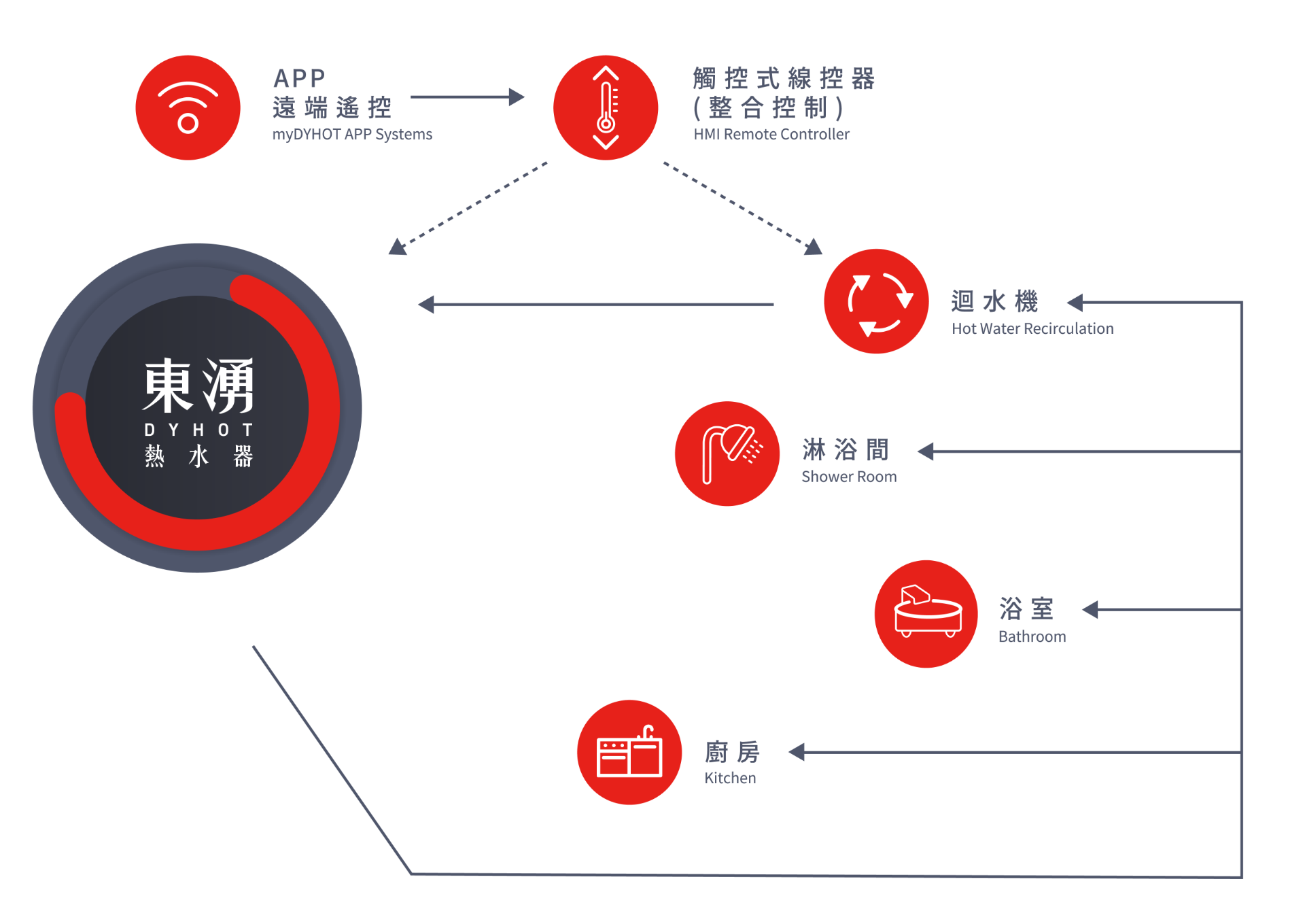 IOT整合控制:APP可同時控制迴水機與熱水器。